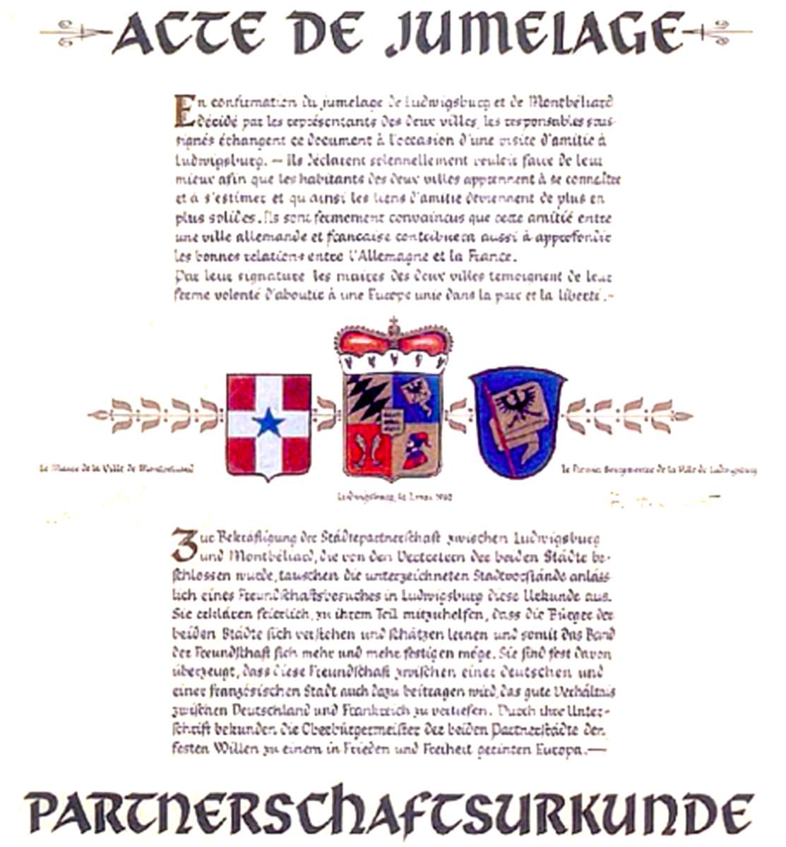 "Le jumelage, c'est la rencontre de deux communes qui entendent s'associer pour agir dans une perspective européenne, pour confronter leurs problèmes et pour développer entre elles des liens d'amitié de plus en plus étroits".